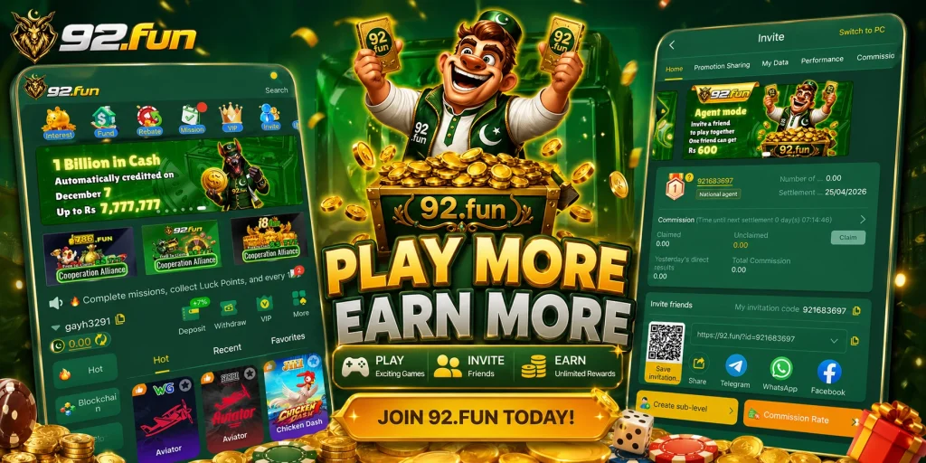 92Fun is an online real money gaming app where users can play different types of games on their mobile phones. Many people in Pakistan search for this app because it offers entertainment, bonuses, and a chance to win real money through gameplay.
